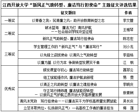 近日,由校纪委主办、理工与农医学院承办的“新风正气助转型、廉洁笃行担使命”主题征文活动圆满结束。在广大教师的热情参与下,共有19篇作品提交评审。经过专家评审,共评选出一等奖1篇、二等奖2篇、三等奖3篇、优秀奖6篇。获奖作品主题突出、内容深刻、文笔流畅,彰显了我校教师对廉洁从教的深刻认识、对学校转型发展的使命担当。